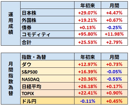 12月末の資産構成です。株式が8割超、コモディティが1割、債券が1割弱と言った構成になっています。好調なコモディティの構成比率が上昇しています。