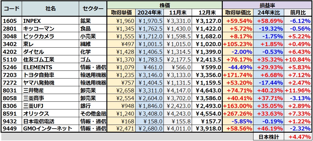年が変わって年間で見てみると持ち株の日本株の中ではINPEXが+58.69%と絶好調でした。ついでGMOインターネットの+46.19%、三井物産の40.23%と続きます。日本株が強い1年でしたね。