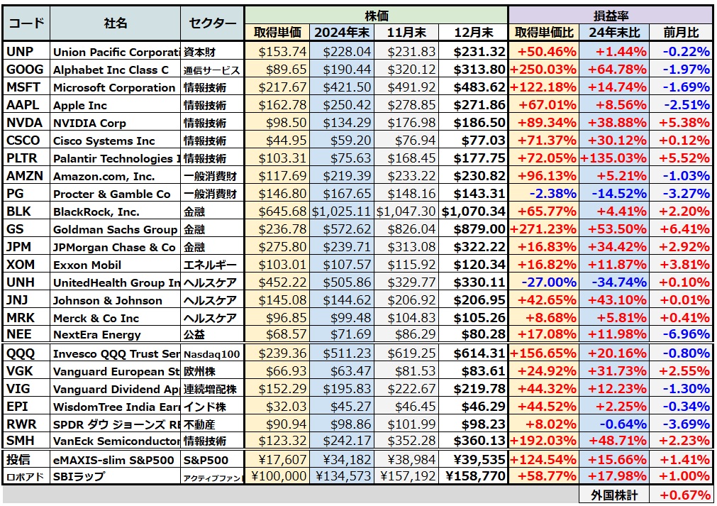 12月の資産運用結果は月間で+2.79%と5月以降8カ月連続のプラスとなりました。年初来でも+25.53%と好調キープをキープしたまま2025年を終えました。