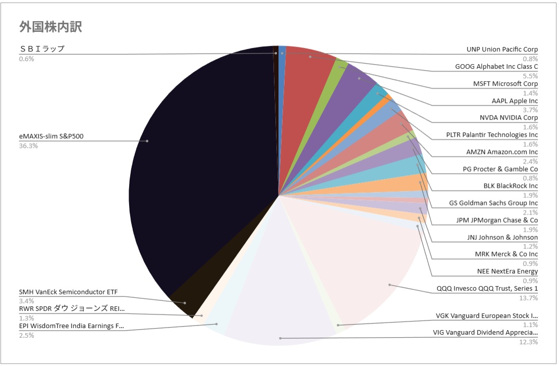 外国株で一番保有比率が高いのはeMAXIS-slim S&P500で外国株の36%を占めています。後保有比率が高いのは、GOOG、QQQ(NASDAQ100ETF)、VIG(連続増配株ETF)あたりです。