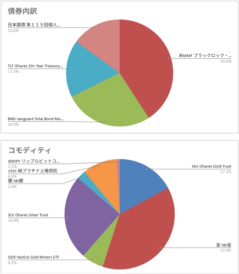 債券は米MMF、BND、TLT、日本国債をそれぞれ保有。コモディティは金銀プラチナをメインに保有。