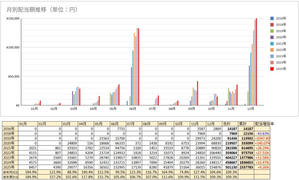 また、2025年の年間配当額は¥501,130(前年比109.3%)と僅かですが50万円を超えました♪~。