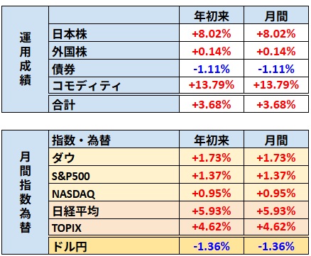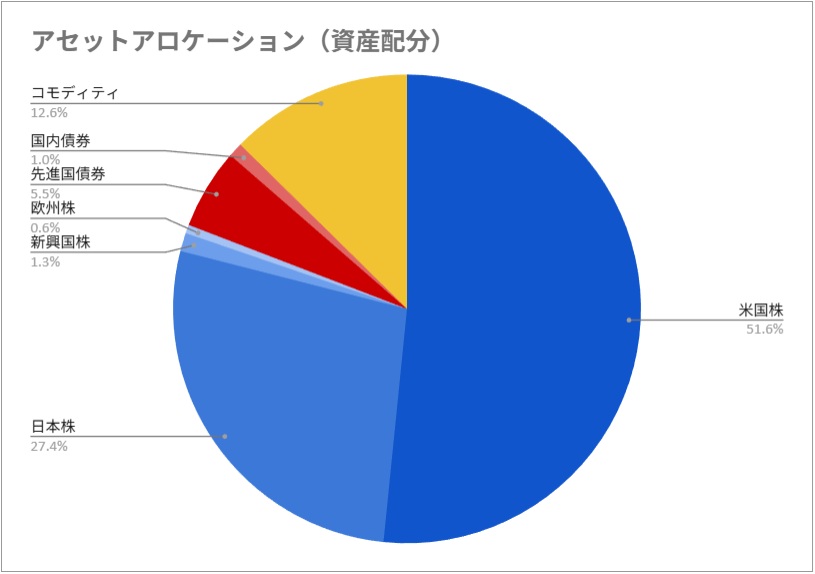 12月末の資産構成です。株式が8割超、コモディティが1割強、債券が1割弱と言った構成になっています。好調なコモディティの構成比率が上昇しています。
