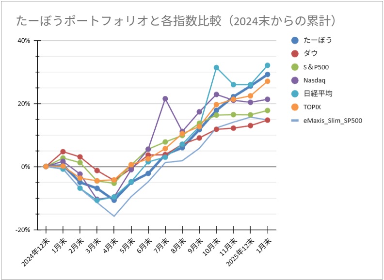2024年末以降のポートフォリオの累計パフォーマンスを他の株価指数と比較しています。