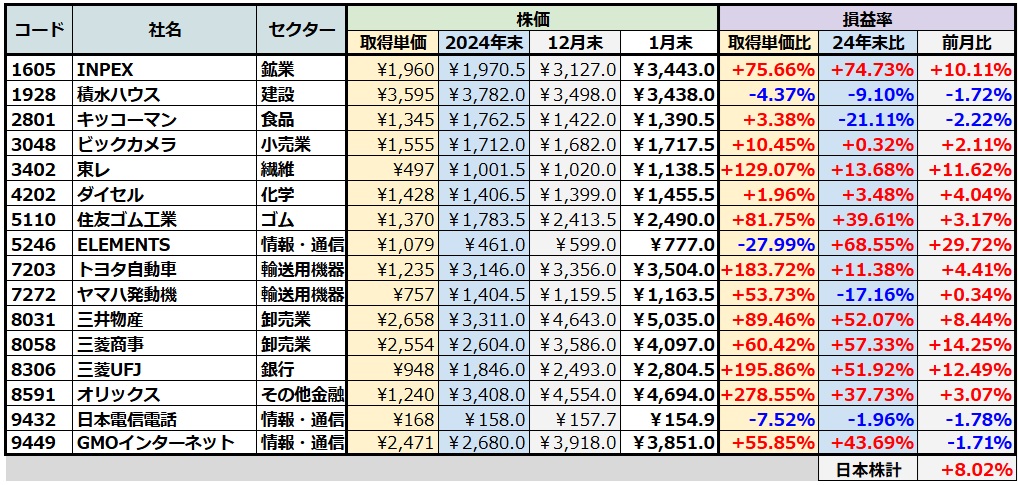 1月は。特にINPEX、東レ、ELEMENTS、三井物産、三菱商事、三菱UFJ辺りが好調でした。特に三井物産、三菱商事、三菱UFJ辺りは保有比率も高いので、僕の日本株が1月に好調だった主要因になっています。