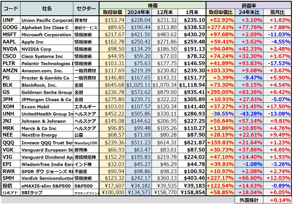 2025年は金銀プラチナが強い年でした。1月も好調を維持しましたが、月末に大暴落があったので一旦はこれまでの上昇傾向がリセットした感じになっています。この先はこれまでみたいに上昇一辺倒とはならずに落ち着くのかなあと言った感じでしょうか。
