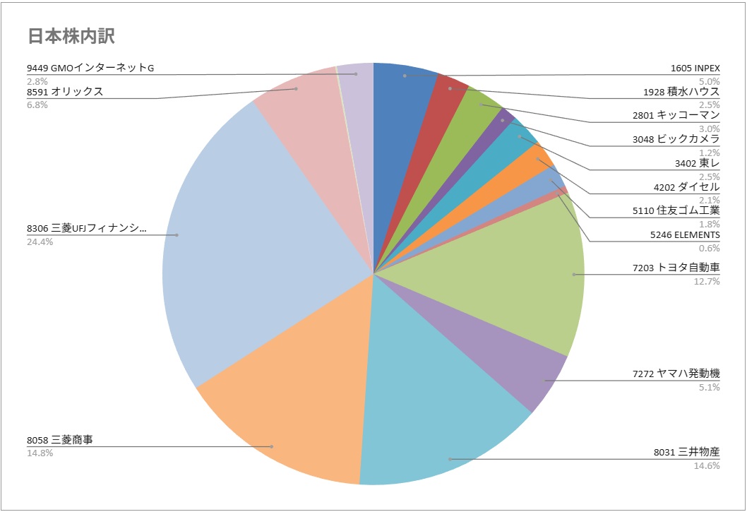 日本株は、個別株で、輸送機器・商社・銀行あたりの大型高配当株をメインに保有中です。