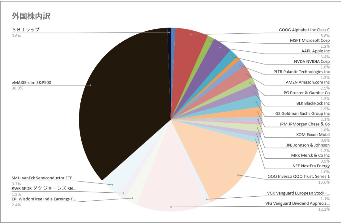 外国株で一番保有比率が高いのはeMAXIS-slim S&P500で外国株の36%を占めています。その他で保有比率が高いのは、GOOG(グーグル)、QQQ(NASDAQ100ETF)、VIG(連続増配株ETF)あたりです。