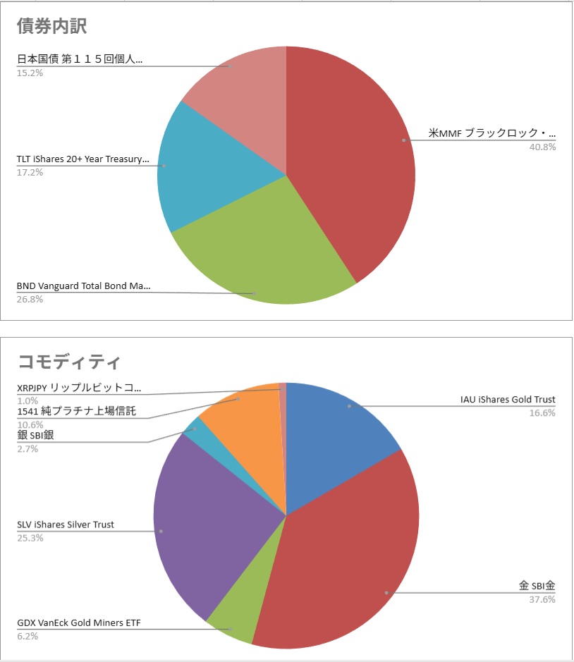 債券は米MMF、BND、TLT、日本国債をそれぞれ保有。コモディティは金銀プラチナをメインに保有。
