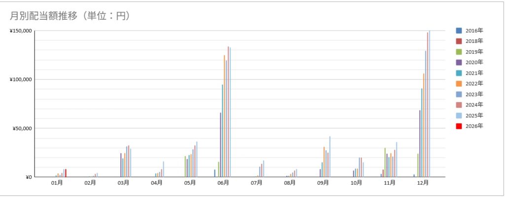 1月と2月は例年配当が少ない月に当たります。去年(2025年)は初めて年間配当額が50万円に到達しました。