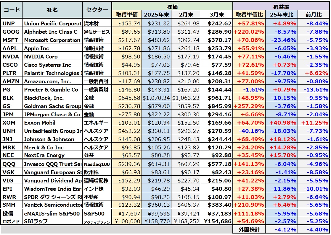 3月は外国株もほとんどマイナスに沈みました。上昇したのはパランティア(PLTR)とエクソンモービル(XOM)のみでした。パランティアは顧客に国防総省があるので軍事銘柄として買われたのかと思われます。エクソンモービルは原油だけで恩恵を受けるエネルギー企業と言うことで上昇したのかと思われます。