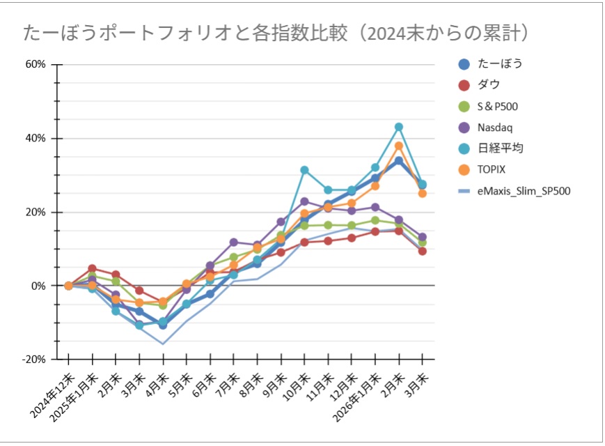 2024年末以降のポートフォリオの累計パフォーマンスを他の株価指数と比較しています。