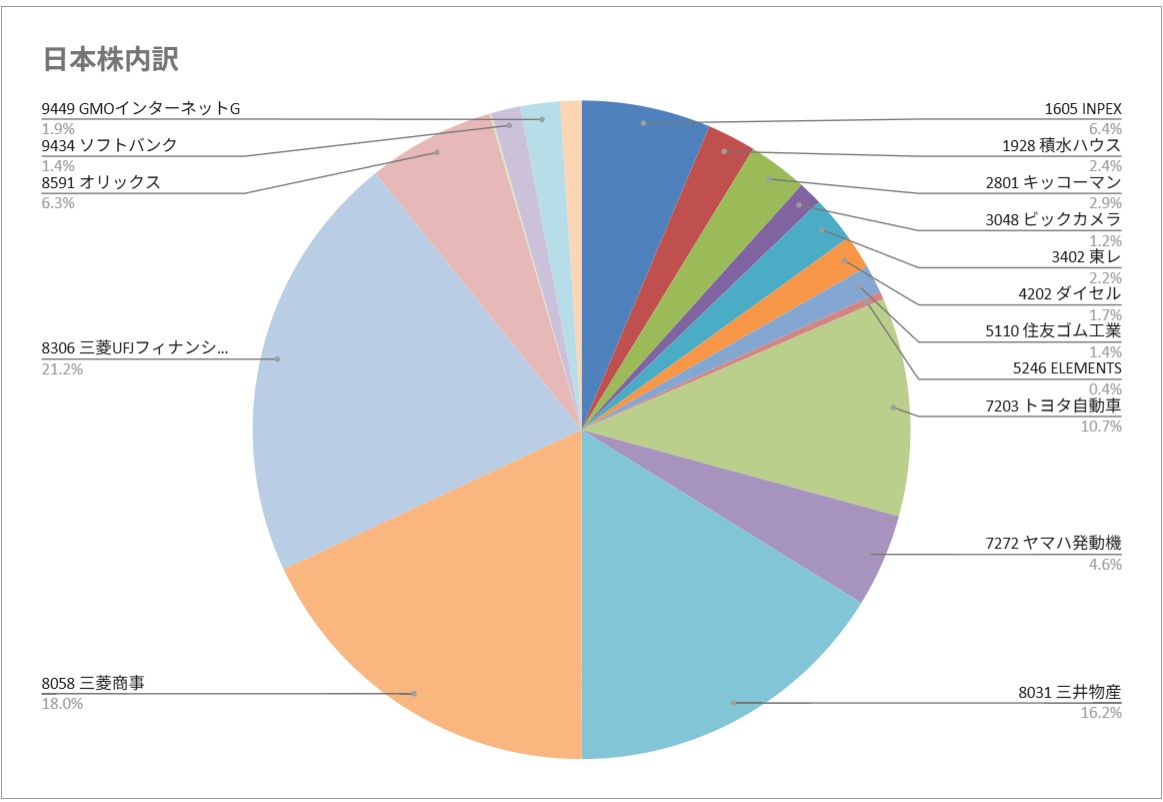 日本株は、個別株で、輸送機器・商社・銀行あたりの大型高配当株をメインに保有中です。あとは優待銘柄もいくつか持っています。