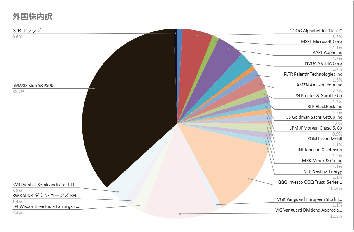 外国株で一番保有比率が高いのはeMAXIS-slim S&P500で外国株の36%を占めています。その他で保有比率が高いのは、GOOG(グーグル)、QQQ(NASDAQ100ETF)、VIG(連続増配株ETF)あたりです。