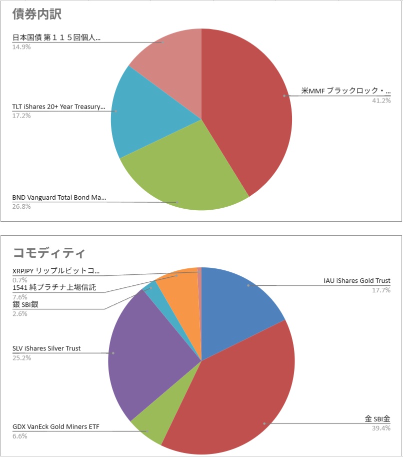 債券は米MMF、BND、TLT、日本国債をそれぞれ保有。コモディティは金銀プラチナをメインに保有。