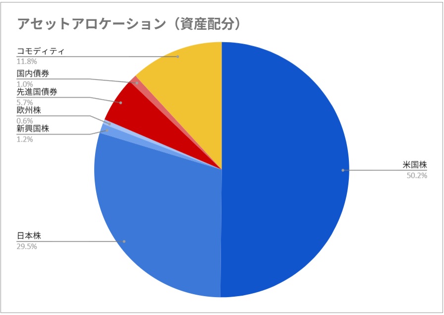 3月末の資産構成です。株式が8割超、コモディティが1割強、債券が1割弱と言った構成になっています。最近ぱっとしない米国株の比率が50%を割りました。代わりに好調な日本株とコモディティの構成比率が上昇しています。