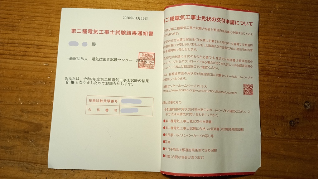 今日2026/1/16は、第二種電気工事士の技能試験の合格発表日でした。結果はめでたく合格でした~♪