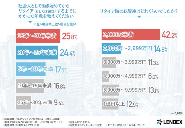 上の調査結果によれば、社会人として働き始めてからリタイヤ(もしくは独立)までにかかった年数は15~20年が最多で25%。この場合仮に22歳で大卒後就職し、15~20年働いた後リタイヤしたとすると、リタイヤ時の年齢は37歳~42歳位になります。まあこれはこんなものなのかなと思いましたが。