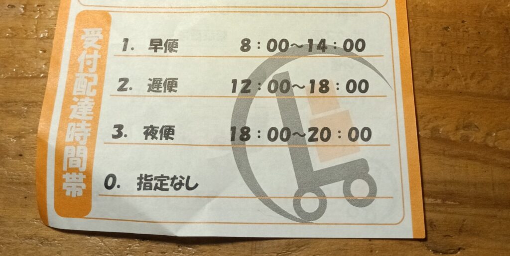 それにしても早便と遅便の時間帯が6時間もある!受け取り側は最大6時間在宅する必要があるのだ。12-14時は何故か早便と遅便の時間帯がダブってるし。夜便だけ2時間しかないのも意味不明だ。ただ夜便は遅れた場合厄介そうだったので再配達は早便で指定した。