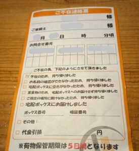 こちらも常時在宅するわけにもいかないので午後は外出した。帰宅したら不在連絡票が届いてた。やっぱりこうなっちゃうよね。午後3時半頃に来たみたい。